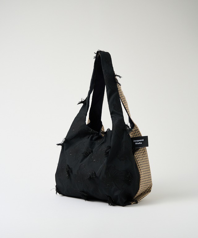 黒い出目金がデザインされたラメ糸がアクセントのカットジャカードと、ベージュのシャンブレーリップル格子と透け感のある淡いブルー地が特徴のジャカード織生地。 同じジャカード織生地でも個性が異なっていて、でもどこかで呼応している、まるで双子(TWINS)のような2種類の布地を組み合わせました。 その日の気分やファッションによって、好きな方をオモテ側に持って使うことが出来ます。 ジャカード織の多様な手触りや風合いを、存分にお楽しみいただけるバッグです。 Mサイズ、Lサイズにはスナップボタンが付いていて、バッグの口が広がり過ぎるのを防ぎます。 ------------------------------------------- MADE IN JAPAN ■素材 <表地>(出目金)綿 70%、ポリエステル 29%、ナイロン 1% (格子) 綿 90%、ポリエステル 10% <裏地> ポリエステル 100% ■お取り扱いについて ・手洗いでのお洗濯、低温アイロンが可能です。 ・タンブラーの使用、漂白剤の使用はお避け下さい。 ・直射日光を避けて陰干しをして下さい。 ・ベンジン・シンナーなどの使用は避けて下さい。 ・縫製部分に負荷がかかり過ぎるのを防ぐため、合計2kg以上ものを入れないで下さい。 ・繊細な生地のため、形状の尖ったものは生地を傷める場合がありますのでご注意下さい。 ■注意事項 ※ご注文をお受けしてから2~5営業日以内に発送いたします。 -------------------------------------------
