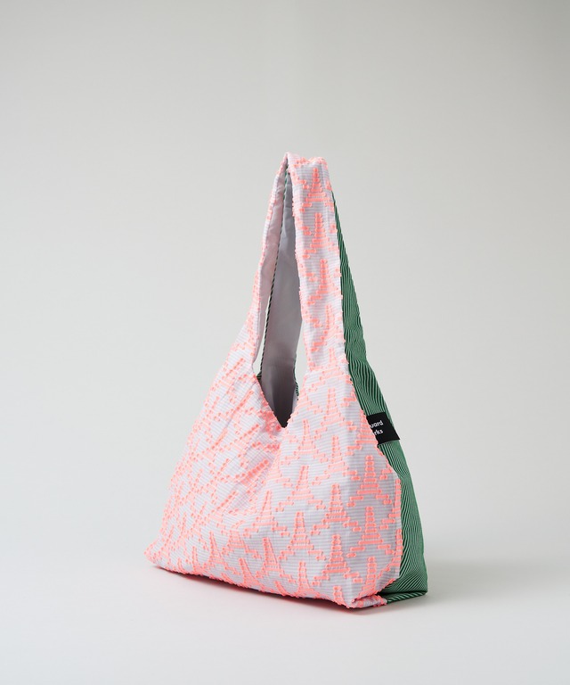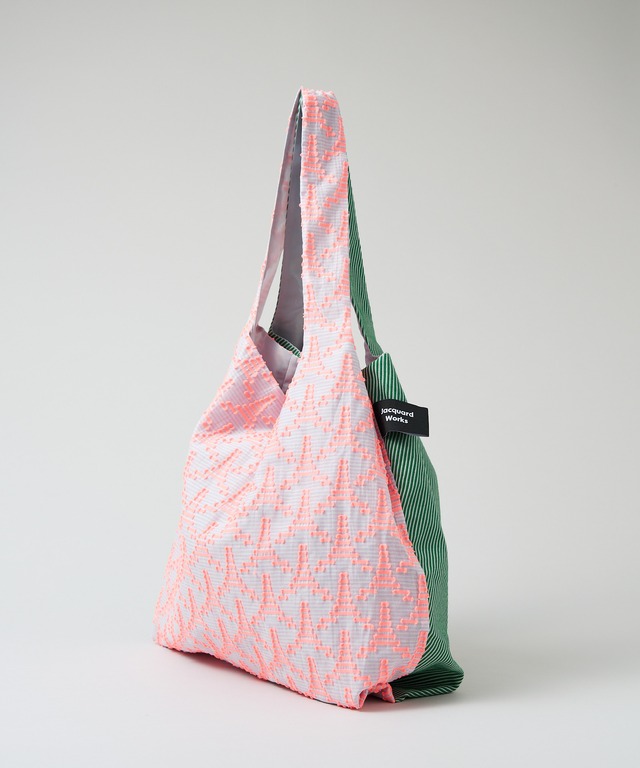 透け感のある白と淡いピンクのボーダー地に並ぶ蛍光ピンクのタワーのような三角形と、グリーンと白の斜めストライプのジャカード織生地。 同じジャカード織生地でも個性が異なっていて、でもどこかで呼応している、まるで双子(TWINS)のような2種類の布地を組み合わせました。 その日の気分やファッションによって、好きな方をオモテ側に持って使うことが出来ます。 ジャカード織の多様な手触りや風合いを、存分にお楽しみいただけるバッグです。 Mサイズ、Lサイズにはスナップボタンが付いていて、バッグの口が広がり過ぎるのを防ぎます。 ------------------------------------------- MADE IN JAPAN ■サイズ S:ヨコ約29cm × タテ約30cm 長財布、携帯、タオルなどの手回り品が入るサイズ。 M:ヨコ約35cm × タテ約35cm A4サイズがタテ、ヨコの両方向に入るサイズ。 L:ヨコ約41cm × タテ約45cm A3サイズがタテ方向に入るサイズ。 ■素材 <表地>(タワー)ナイロン 60%、綿40% (綾) 綿 60%、ポリエステル 30%、麻 10% ※撥水加工済み <裏地> ポリエステル 100% ■お取り扱いについて ・手洗いでのお洗濯、低温アイロンが可能です。 ・タンブラーの使用、漂白剤の使用はお避け下さい。 ・直射日光を避けて陰干しをして下さい。 ・ベンジン・シンナーなどの使用は避けて下さい。 ・縫製部分に負荷がかかり過ぎるのを防ぐため、合計2kg以上ものを入れないで下さい。 ・繊細な生地のため、形状の尖ったものは生地を傷める場合がありますのでご注意下さい。 ■注意事項 ※ご注文をお受けしてから2~5営業日以内に発送いたします。 -------------------------------------------