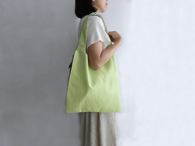 透け感のある白の上にオーロララメのドットが散りばめられたシャリ感のある生地と、鮮やかなライム色にラメ糸を混ぜたジャカード織生地。 同じジャカード織生地でも、個性が異なっていて、でもどこかで呼応している、まるで双子(TWINS)のような2種類の布地を組み合わせました。 その日の気分やファッションによって、好きな方をオモテ側に持って使うことが出来ます。 ジャカード織の多様な手触りや風合いを、存分にお楽しみいただけるバッグです。 Mサイズ、Lサイズにはスナップボタンが付いていて、バッグの口が広がり過ぎるのを防ぎます。 ------------------------------------------- MADE IN JAPAN ■サイズ S:ヨコ約29cm × タテ約30cm 長財布、携帯、タオルなどの手回り品が入るサイズ。 M:ヨコ約35cm × タテ約35cm A4サイズがタテ、ヨコの両方向に入るサイズ。 L:ヨコ約41cm × タテ約45cm A3サイズがタテ方向に入るサイズ。 ■素材 <表地>(ドット) レーヨン 94%、ポリエステル 5%、ナイロン 1% (ライム) ポリエステル 57%、綿 36%、レーヨン 7% <裏地> ポリエステル 100% ■お取り扱いについて ・手洗いでのお洗濯、低温アイロンが可能です。 ・タンブラーの使用、漂白剤の使用はお避け下さい。 ・直射日光を避けて陰干しをして下さい。 ・ベンジン・シンナーなどの使用は避けて下さい。 ・縫製部分に負荷がかかり過ぎるのを防ぐため、合計2kg以上ものを入れないで下さい。 ・繊細な生地のため、形状の尖ったものは生地を傷める場合がありますのでご注意下さい。 ■注意事項 ※ご注文をお受けしてから2~5営業日以内に発送いたします。 -------------------------------------------