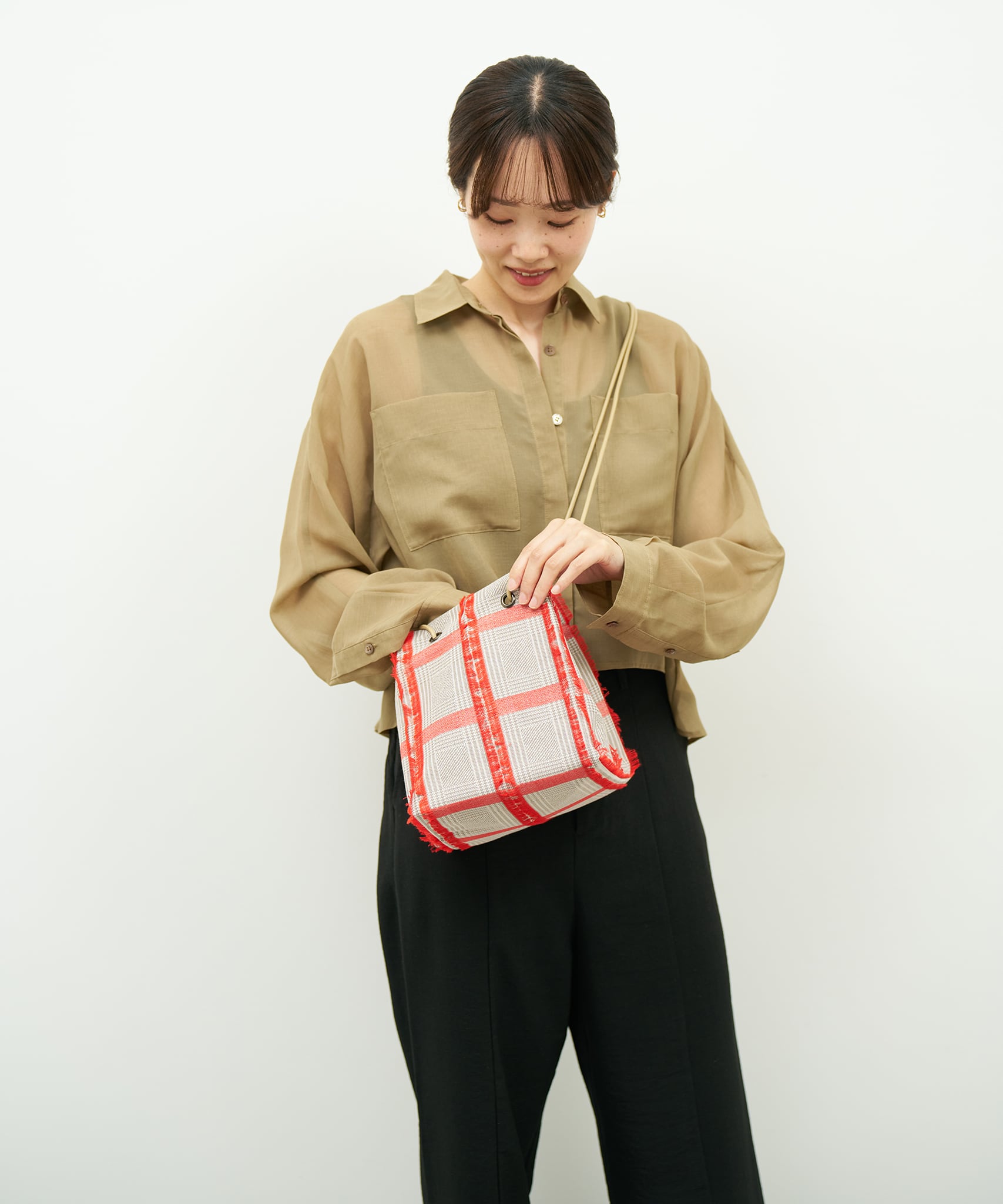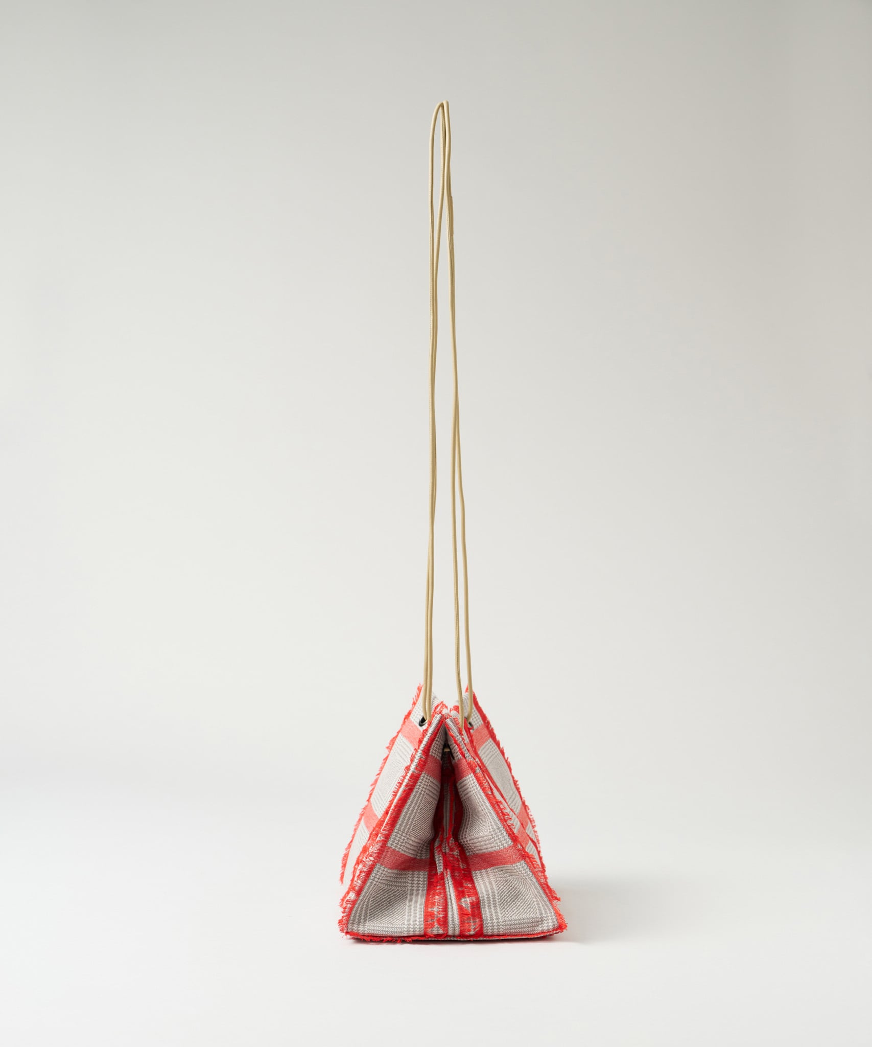 白黒のグレンチェックの生地をベースに、アクセントカラーのカットジャカードがふさふさとしていて、トラッドな雰囲気の中にも、クールさと可愛さを併せ持つスクエア型のポシェットです。