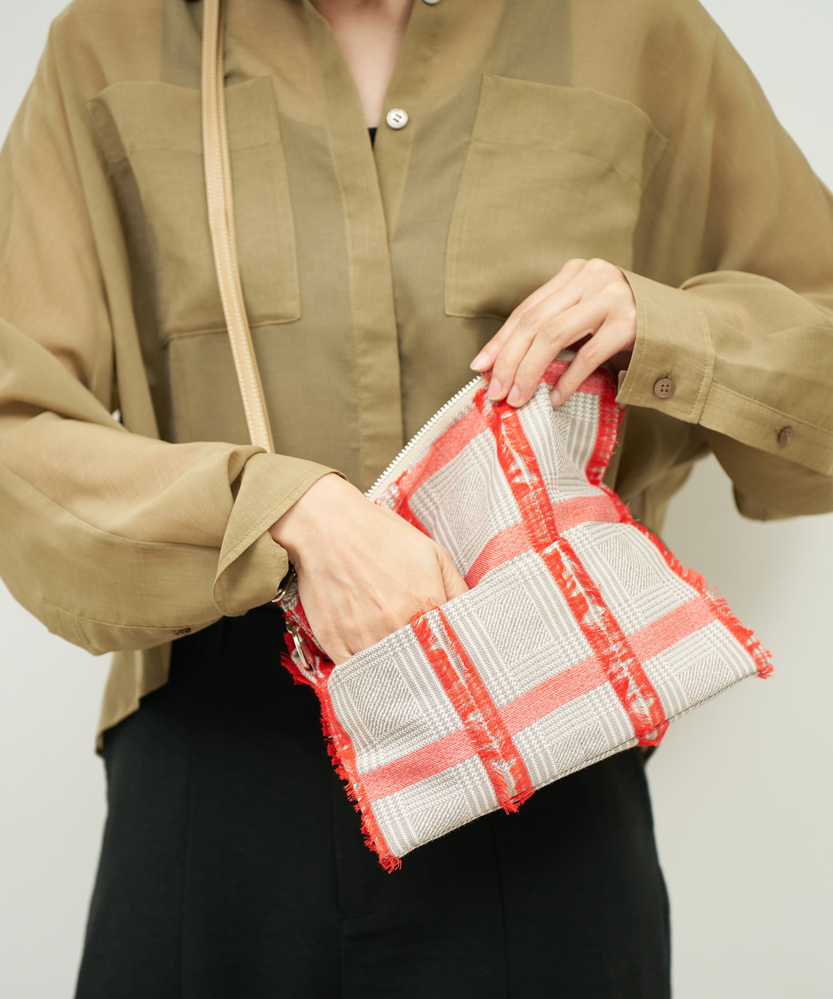 白黒のグレンチェックの生地をベースに、アクセントカラーのカットジャカードがふさふさとしていて、トラッドな雰囲気の中にも、クールさと可愛さを併せ持つジャカード織生地のデイリーバッグです。