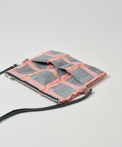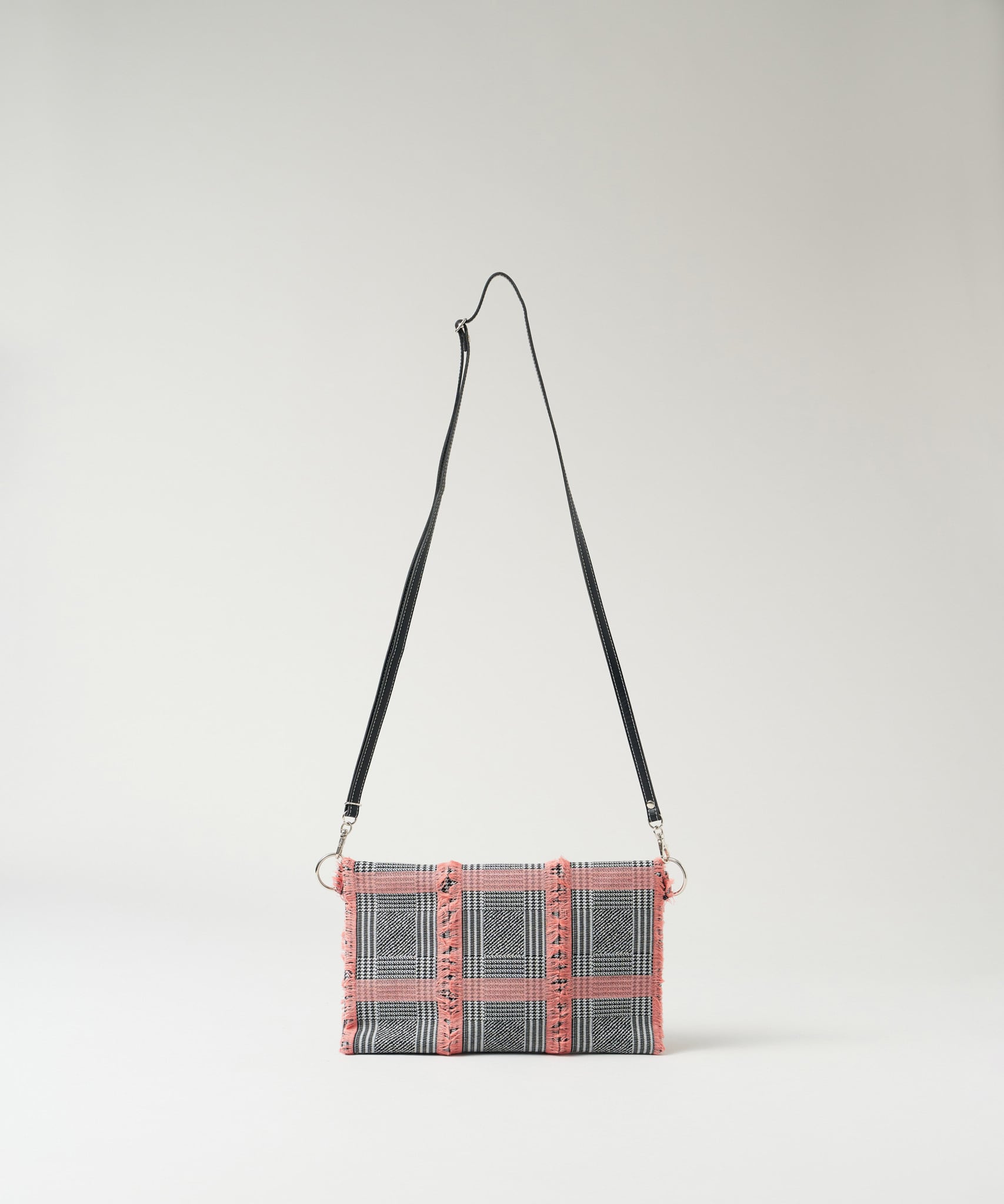 白黒のグレンチェックの生地をベースに、アクセントカラーのカットジャカードがふさふさとしていて、トラッドな雰囲気の中にも、クールさと可愛さを併せ持つジャカード織生地のデイリーバッグです。