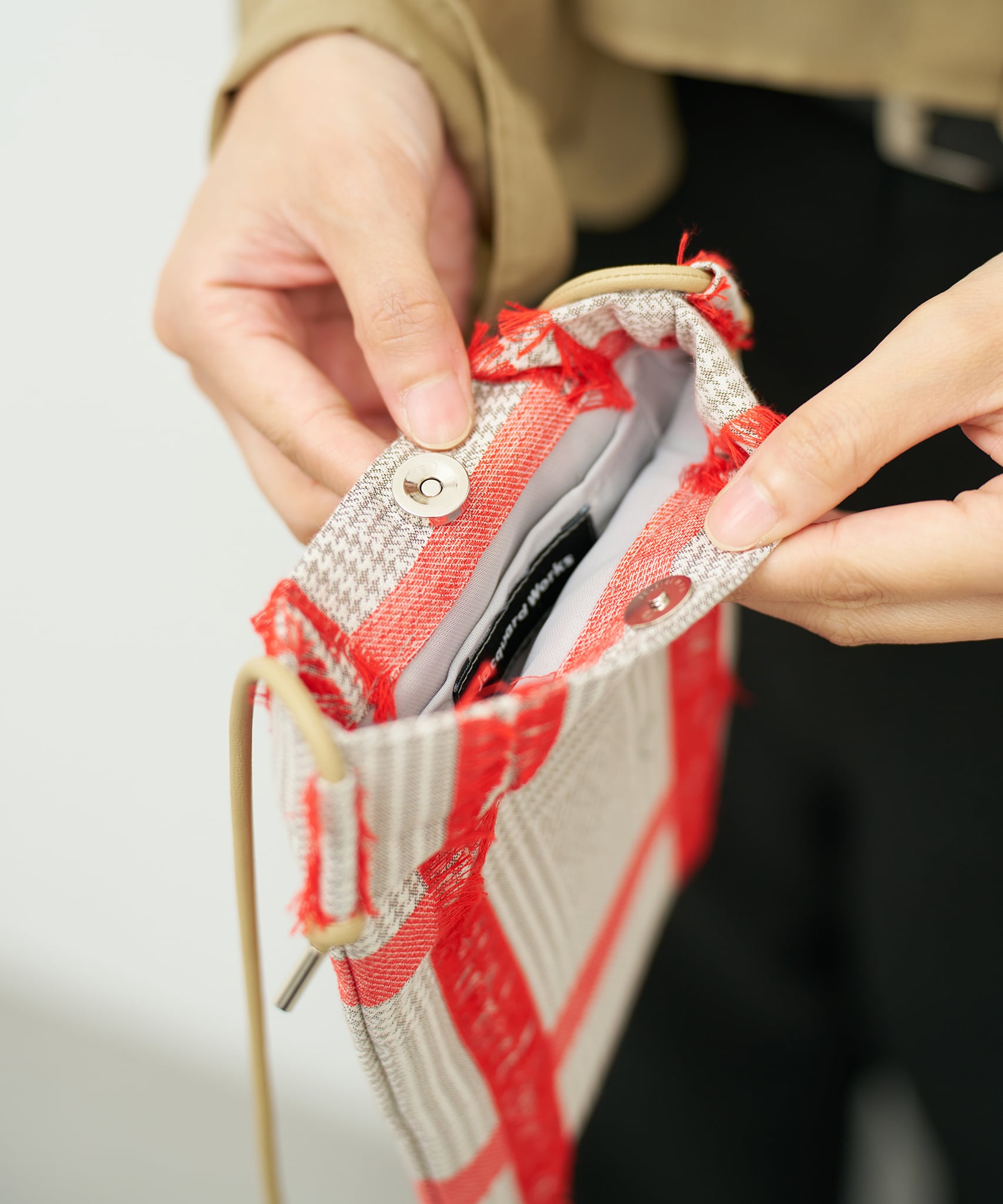 白黒のグレンチェックの生地をベースに、アクセントカラーのカットジャカードがふさふさとしていて、トラッドな雰囲気の中にも、クールさと可愛さを併せ持つジャカード織生地のデイリーバッグです。