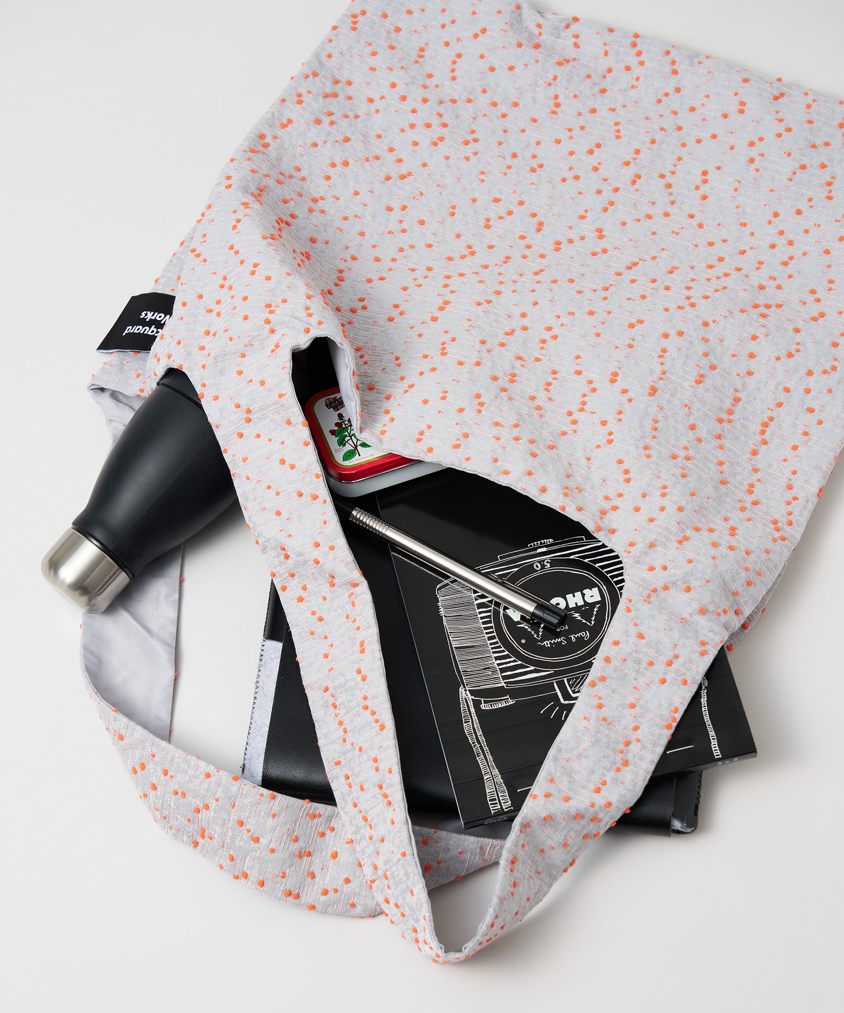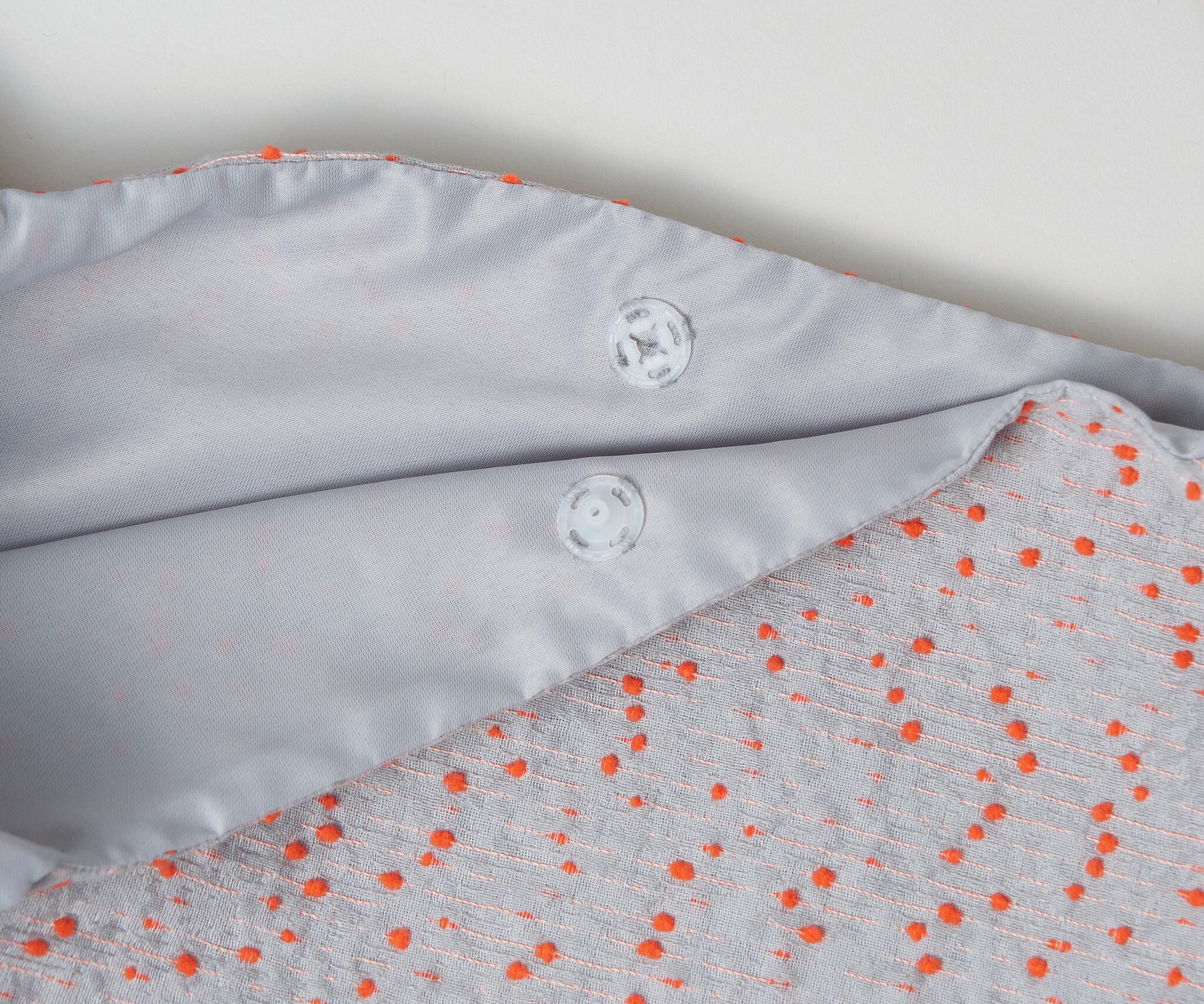 やや厚みのあるライトグレーの生地に、オレンジ色でポチポチとした手触りが楽しいドットを散りばめた、ポップで可愛らしいジャカード織生地。
