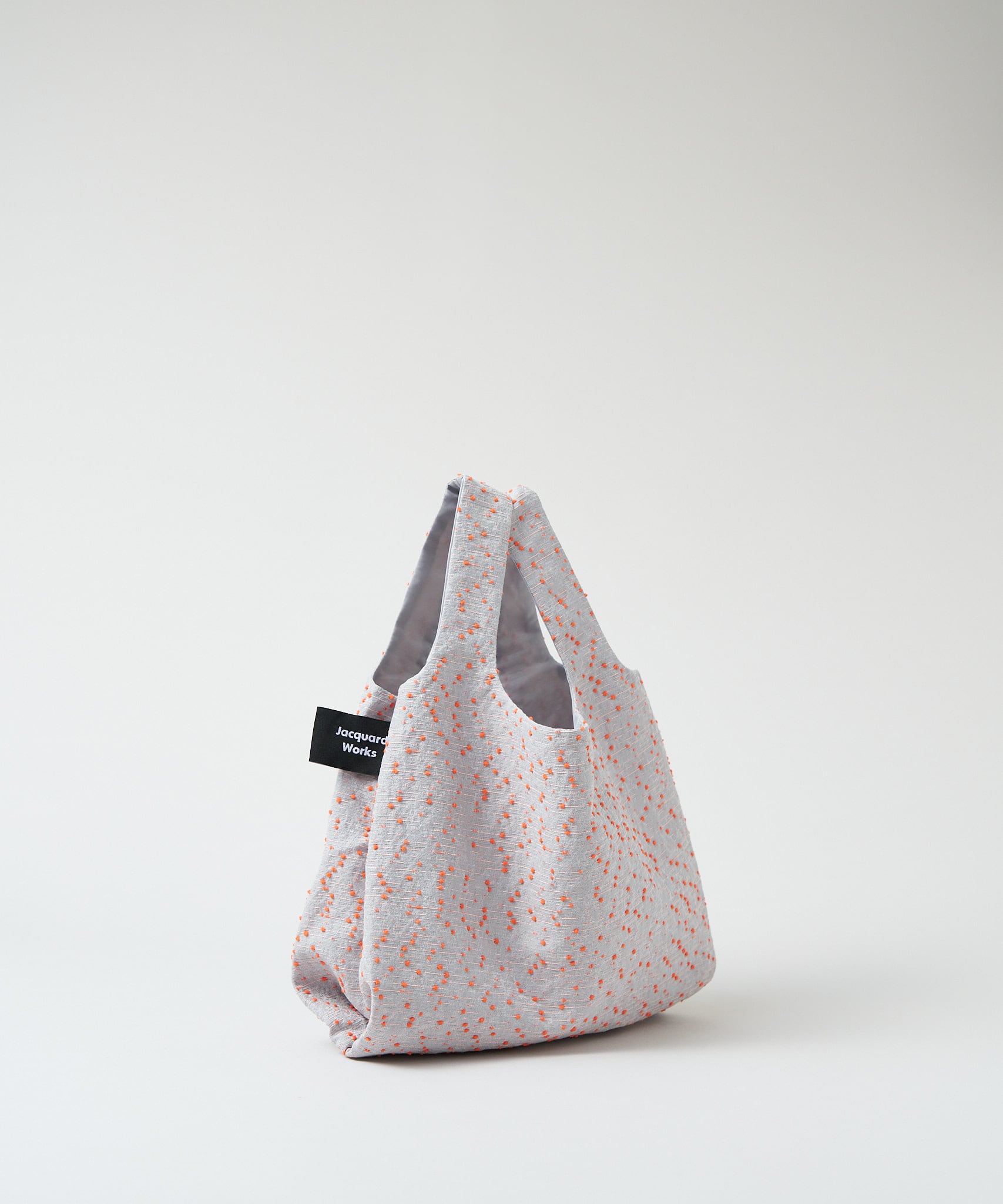 やや厚みのあるライトグレーの生地に、オレンジ色でポチポチとした手触りが楽しいドットを散りばめた、ポップで可愛らしいジャカード織生地。