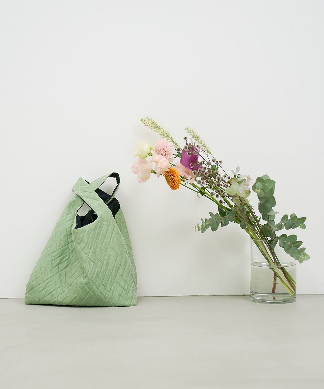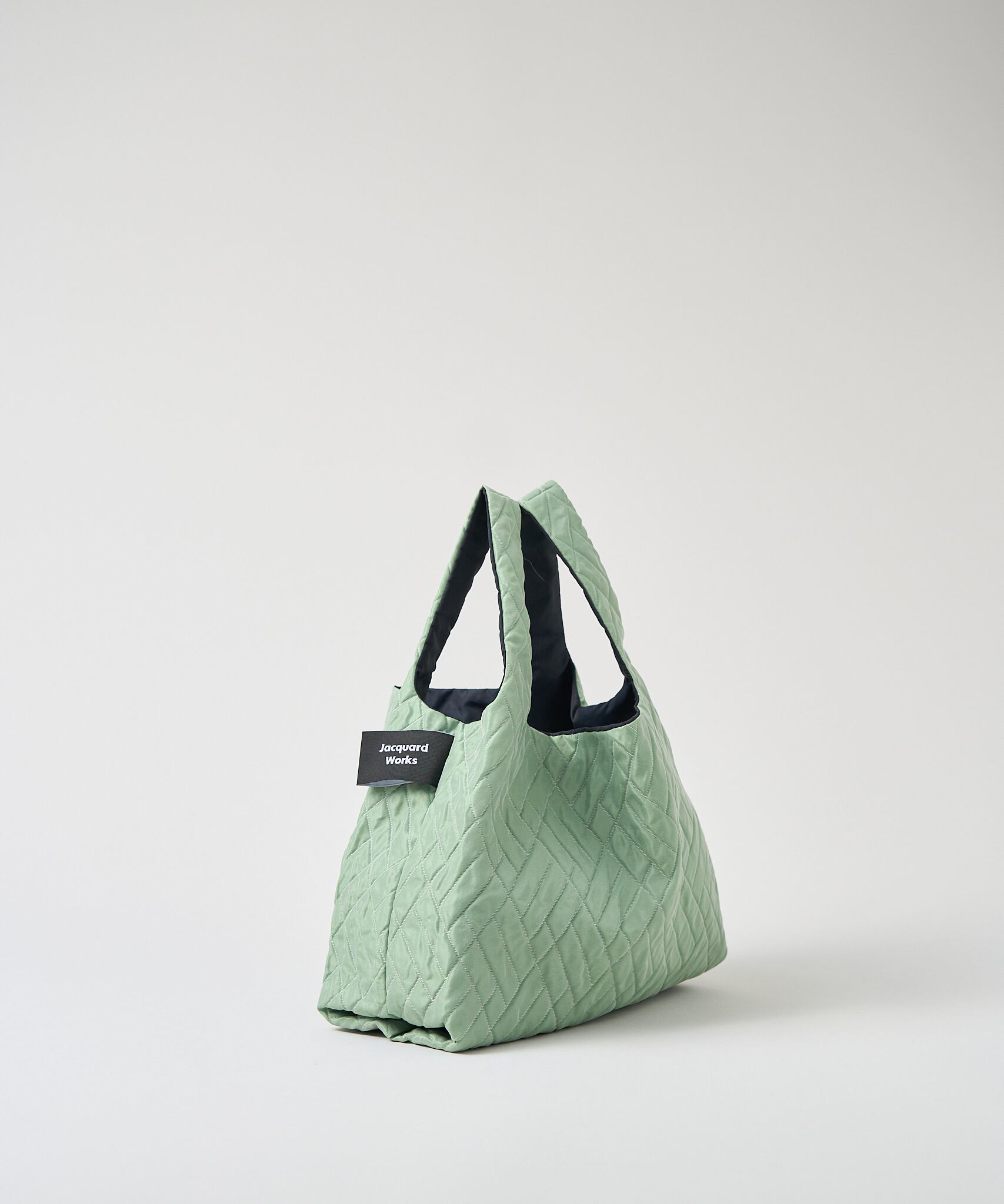 ややパステル調のつや感のあるグリーンで、キルティング生地のようなふわっとした表情を持つマトラッセのジャカード織生地。