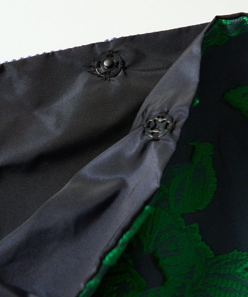 透け感のある紺色とグリーンのボーダー地の上にグリーンの花柄を表現したカットジャカードと、鮮やかなブルーと白の斜めストライプのジャカード織生地。