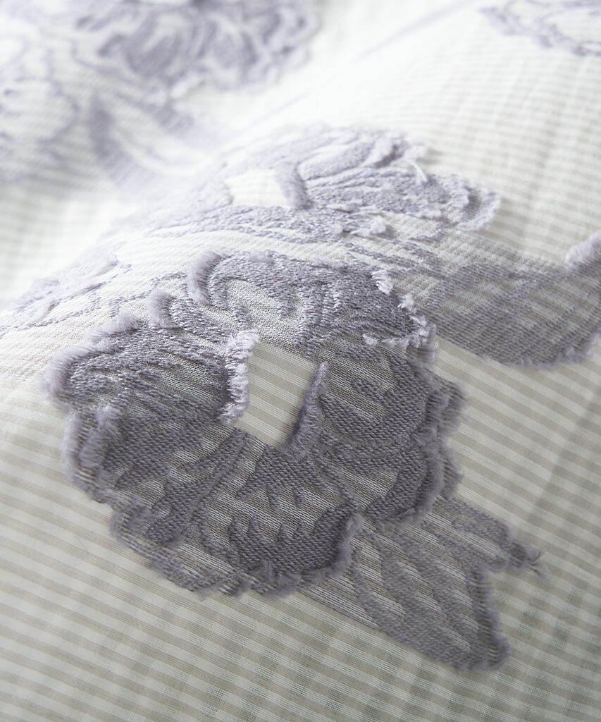 透け感のある白とライトグレーのボーダー地の上にグレーの花柄を表現したカットジャカードと、シャリ感のあるアイスグリーンのサテンシャンブレー無地のジャカード織生地。
