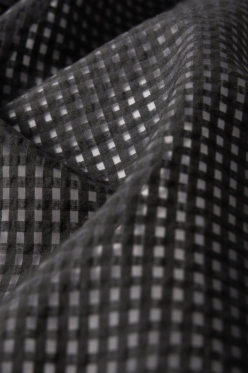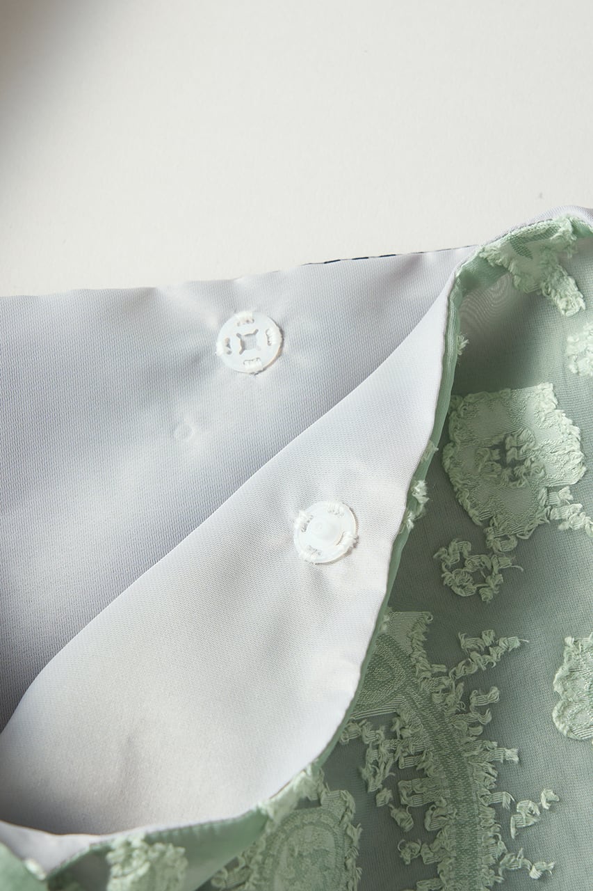 透け感のあるアイスグリーンのペイズリー柄で、はり感のあるふんわりとしたカットジャカードと、ブラックで透け感があり、クラシックな雰囲気のある格子柄のジャカード織生地。