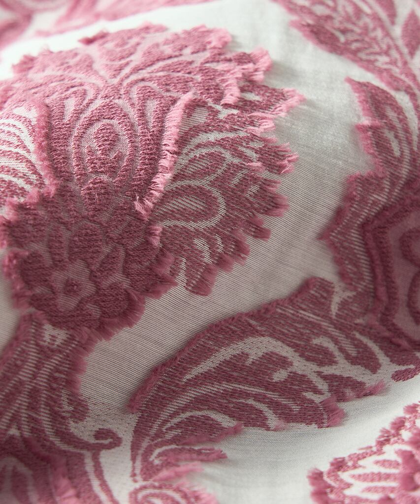 白地の上に落ち着いたピンク色でかたどったダマスク模様のカットジャカードと、柔らかさのあるブルージーンズのような風合いのジャカード織生地。