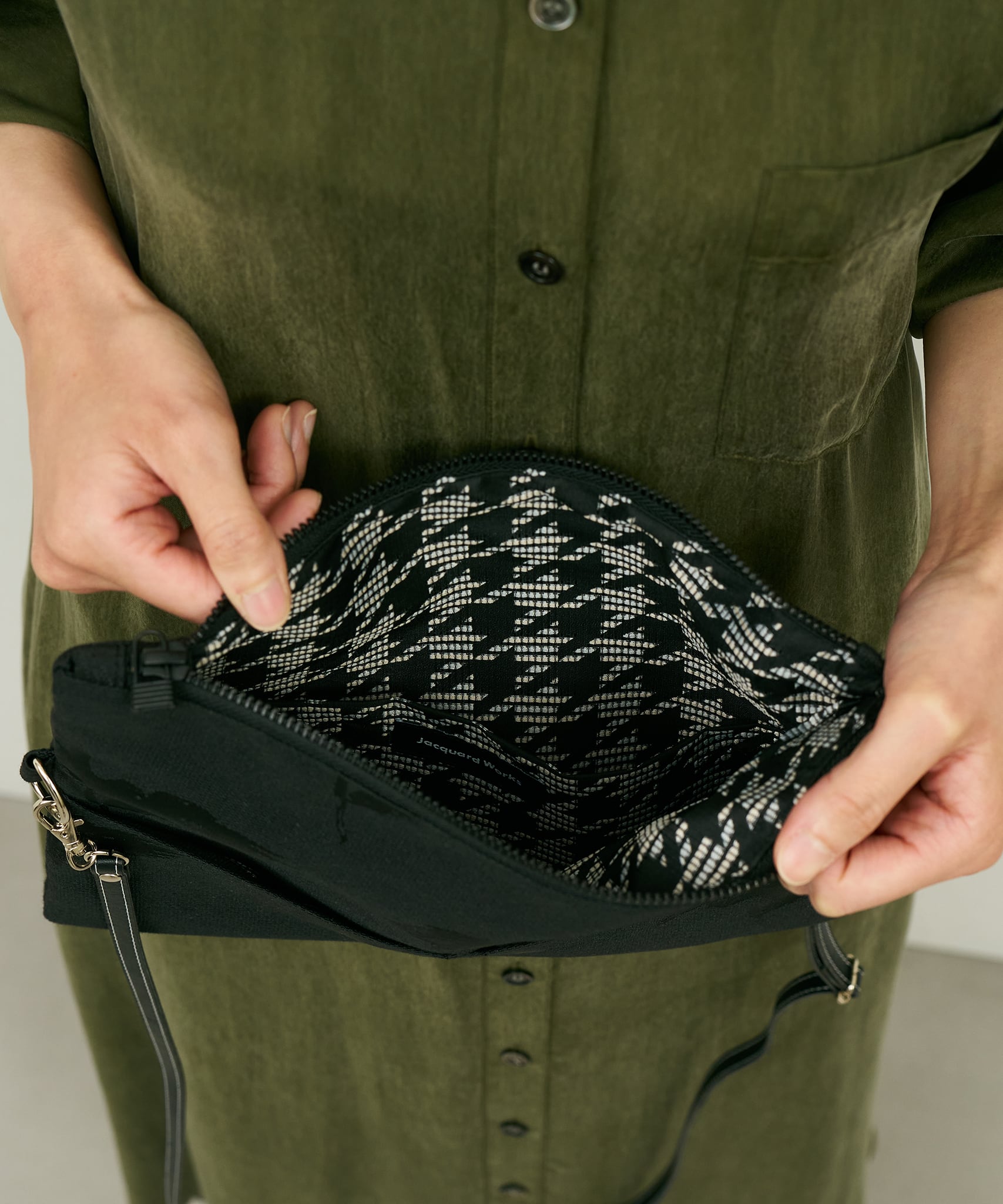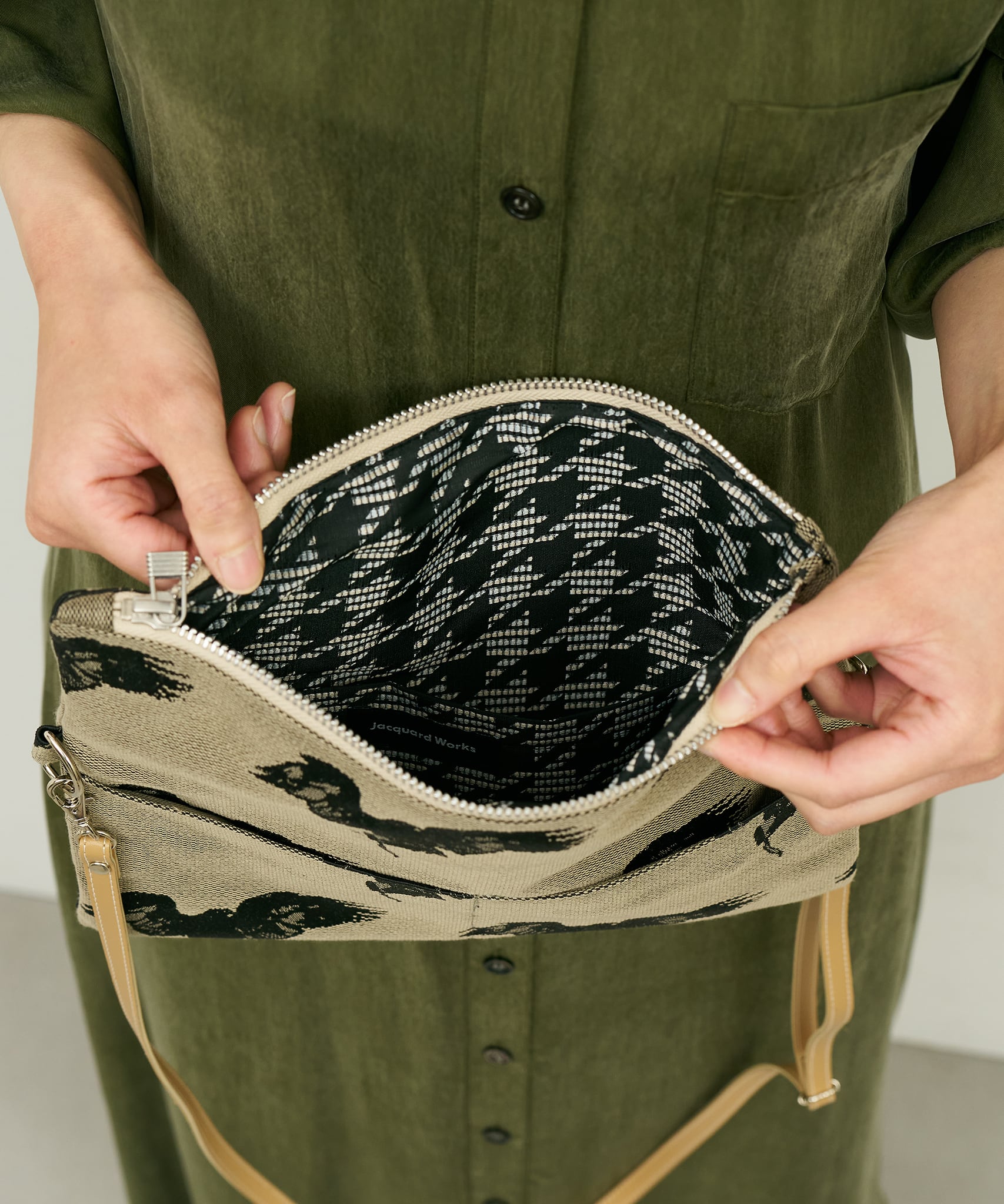 バッグ内側の千鳥格子も、Jacquard Worksオリジナルのジャカード織生地です。落ち着いたトーンでフォーマル/カジュアルどちらでも合わせて頂くことが可能。ユニセックスにお使い頂けます。