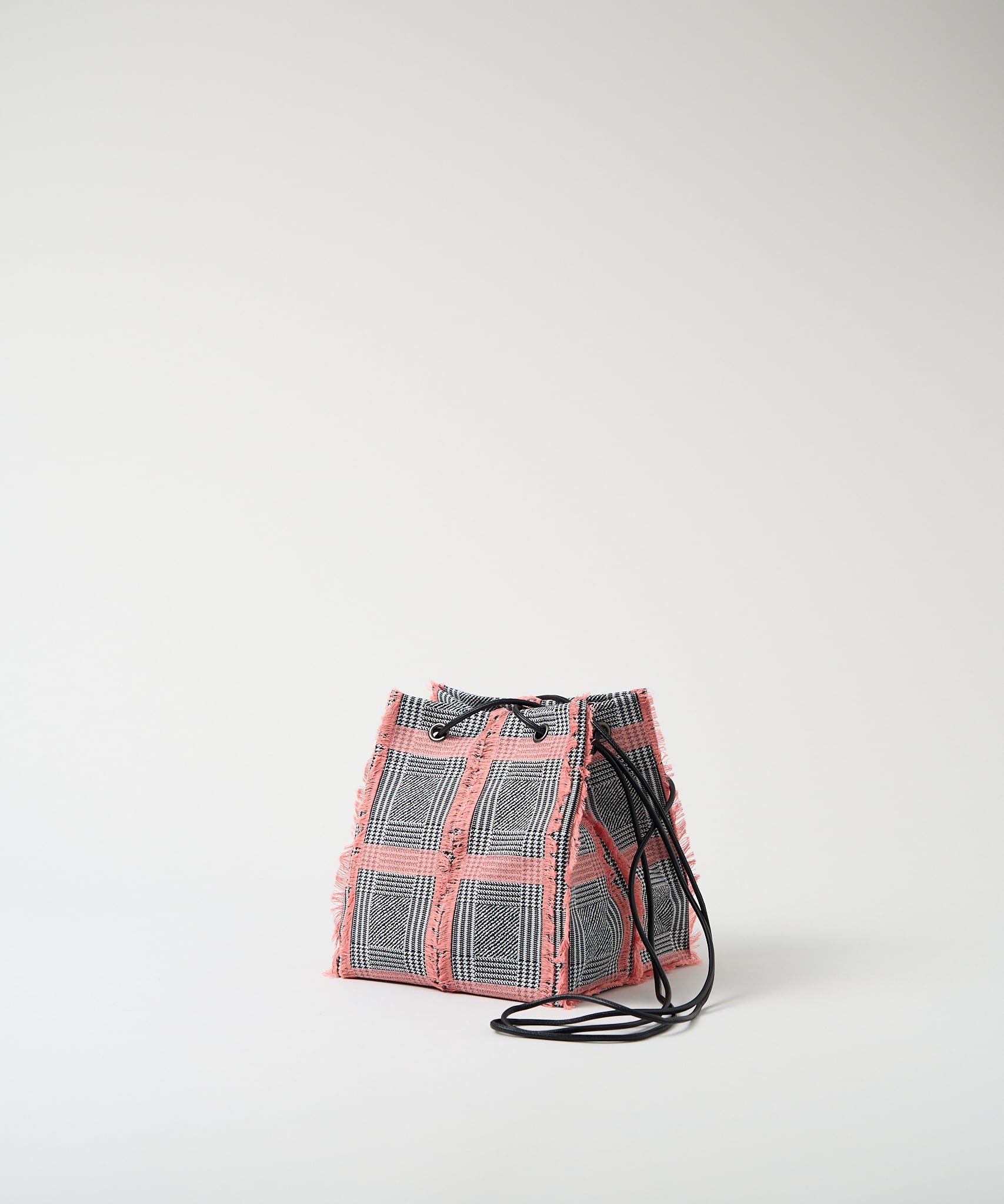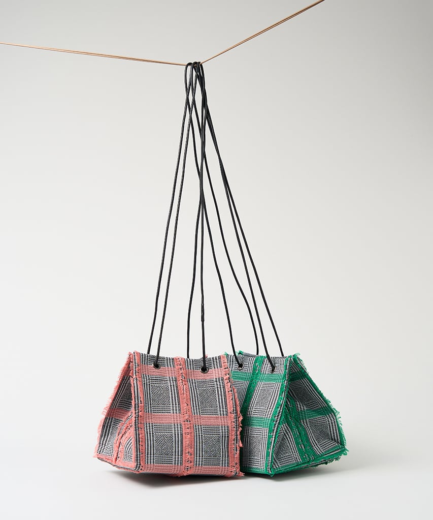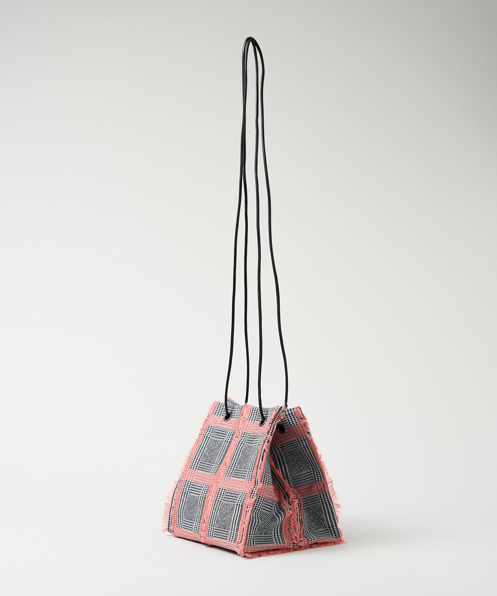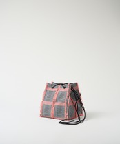 白黒のグレンチェックの生地をベースに、アクセントカラーのカットジャカードがふさふさとしていて、トラッドな雰囲気の中にも、クールさと可愛さを併せ持つスクエア型のポシェットです。
