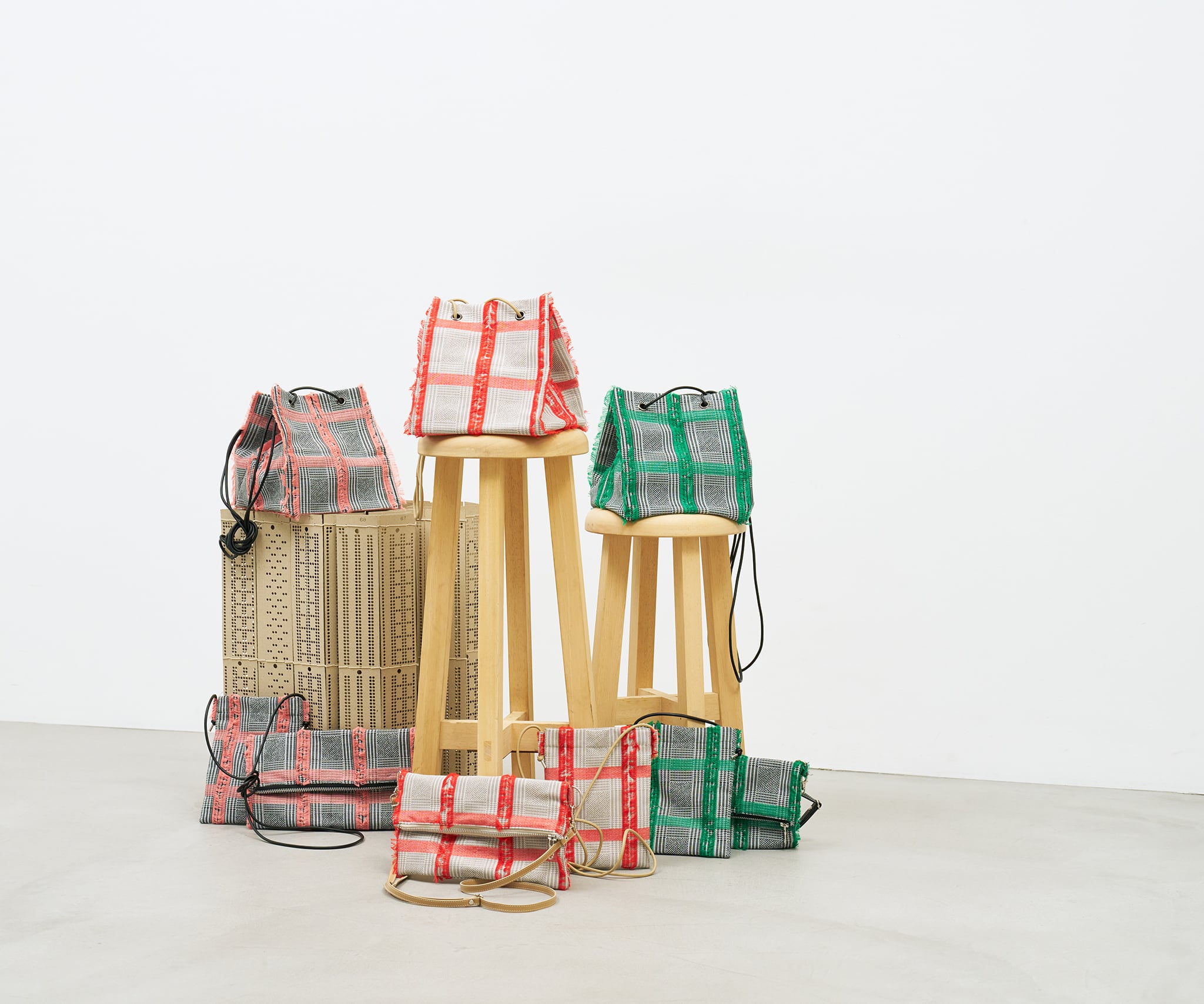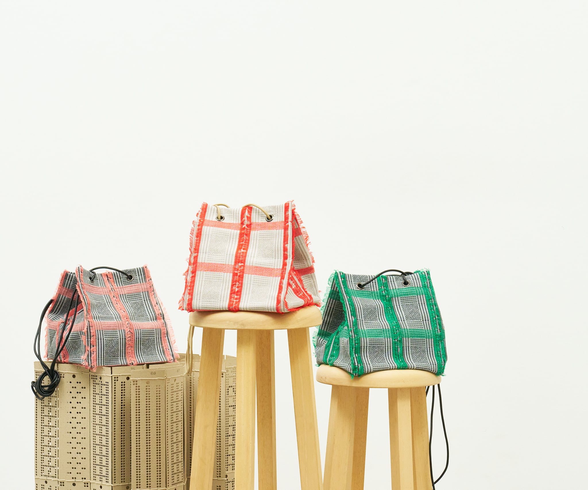 白黒のグレンチェックの生地をベースに、アクセントカラーのカットジャカードがふさふさとしていて、トラッドな雰囲気の中にも、クールさと可愛さを併せ持つスクエア型のポシェットです。